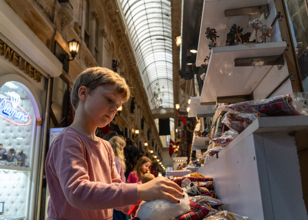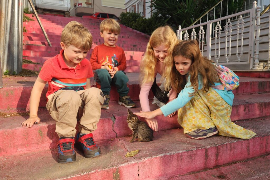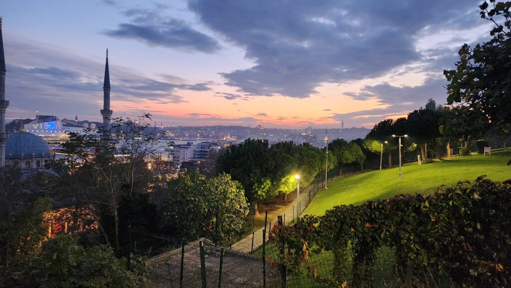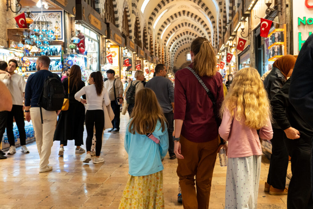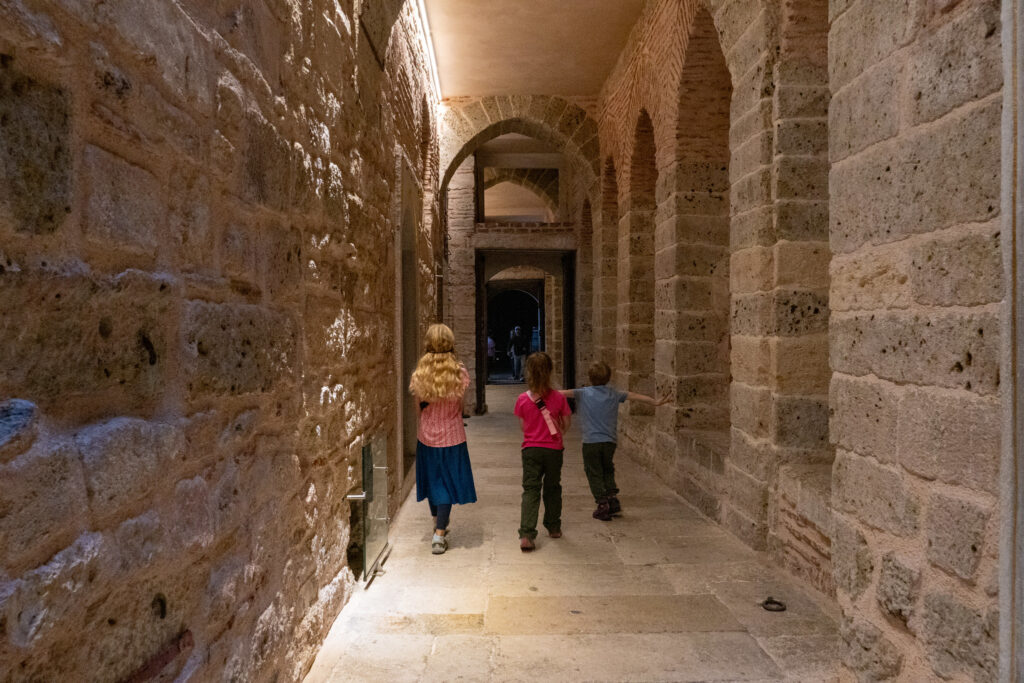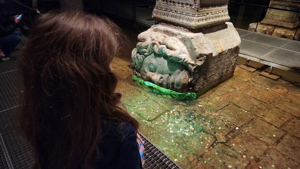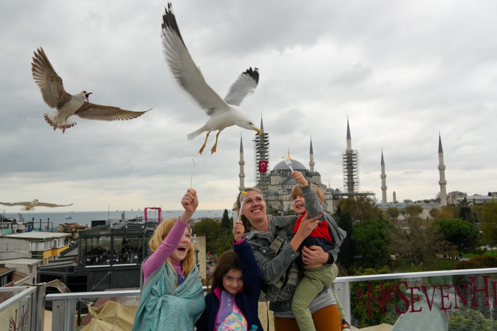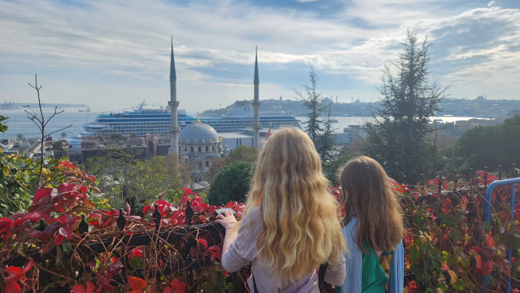 Our last full day, we kicked off the day with a visit to the Basilica Cistern. We bought four skip the line tickets ahead of time and brought passports for the two youngest to get them in without a ticket. We only spent about an hour there but it was a somewhat magical experience. Afterwards, we enjoyed snacks nearby before heading to the Blue Mosque before long lines formed. The kids received a free snack from a volunteer on our way in and we didn’t wait long before going in an experiencing the Blue Mosque. Then, we hit different spots on the walking tour we developed for the day, including many items from the kids’ scavenger hunt we developed for them. Though we couldn’t see the cistern under the Nakkaş Carpet Store, we did learn much about the making of Turkish rugs. We ate lunch at 7 Hills, where we enjoyed delicious but overpriced food with a lovely view. They provide bread on forks to feed seagulls on the roof, making very fun videos and photos for our family. We ended the day with a little more play and Dodurma.